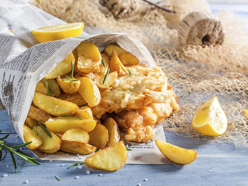 Le « pour emporter » préféré des Britanniques est ici complètement revu, car on remplace la friture par une cuisson au four: le résultat final est presque aussi savoureux, mais beaucoup plus sain.